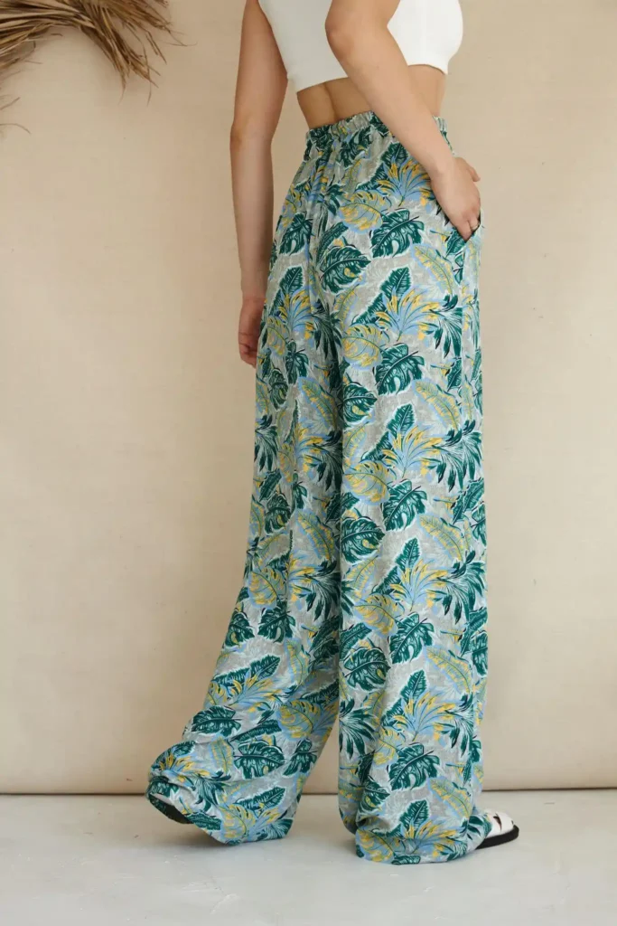 - Wide-leg trousers combined with a fitted crop top offer a balanced and modern outfit.